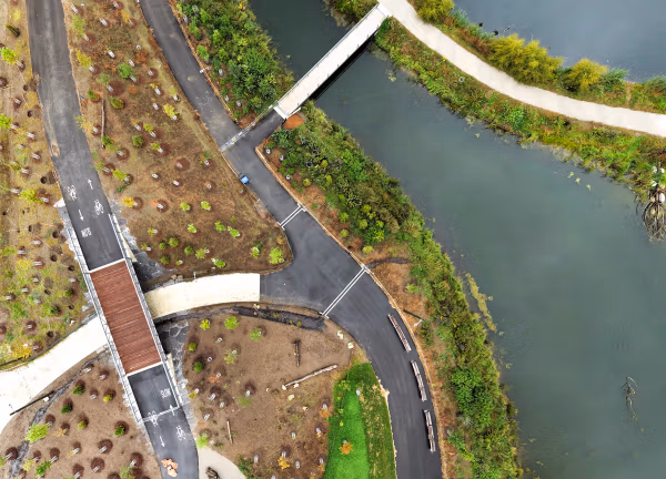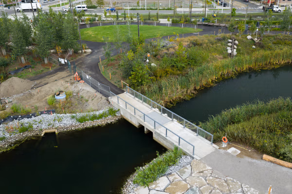 Over 1.4 million cubic metres of soil were removed to create a naturalized river valley with channels and wetlands to mimic local ecosystems. Advanced erosion control and native plantings protect the banks, while a network of stormwater and utility systems, equipped with smart sensors, adapts to both minor and extreme weather events.