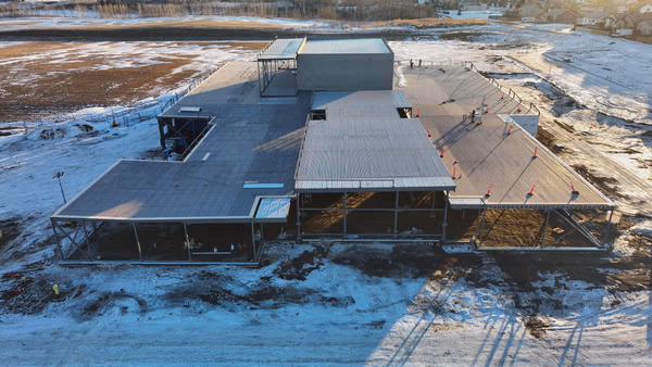 Structural steel installation began in November 2025, marking the shift from groundwork to active vertical construction. Substantial progress has followed, with structural steel now largely complete and roof deck installation finished across most areas, with the remaining section scheduled for completion following upcoming OWSJ installation.
