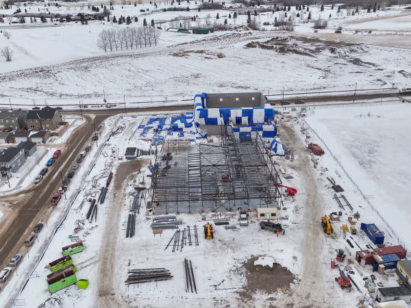 At Okotoks, key steel framing components are now standing tall following the first slab‑on‑grade pour in November 2025, with heated slab systems ensuring proper curing and durability through winter conditions. Masonry activities continue to advance as well, including ongoing elevator shaft masonry that will support future vertical circulation and interior build‑out.