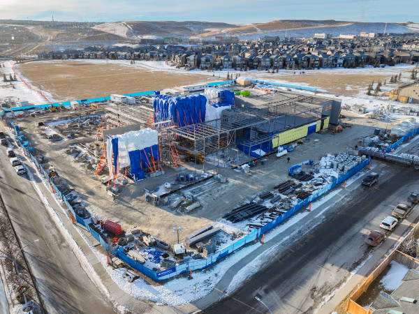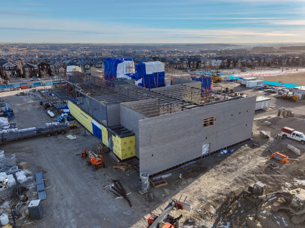 With foundations, piles, and deep services substantially complete, the Airdrie team continues to make steady progress, with masonry work keeping activity consistent as winter sets in.
