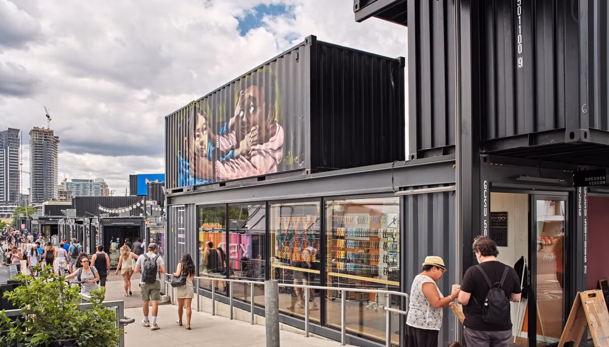 Stackt Market is a three-storey outdoor marketplace in downtown Toronto, created by stacking and connecting repurposed shipping containers to form a vibrant and modular retail destination. The ground level features shops and eateries, while the upper levels provide architectural massing and visual connectivity across the site. A snake-like arrangement of containers links the east and west ends, and a striking vertical tower with a cantilevered container at the Bathurst Street entrance enhances the site’s presence. Designed as a temporary activation of underutilized land, the project transforms a former industrial site once used for coal storage into a lively urban space. Site development included utilities, landscaping, container foundations, and installation, all carefully integrated to support the market’s flexible and community-focused design.