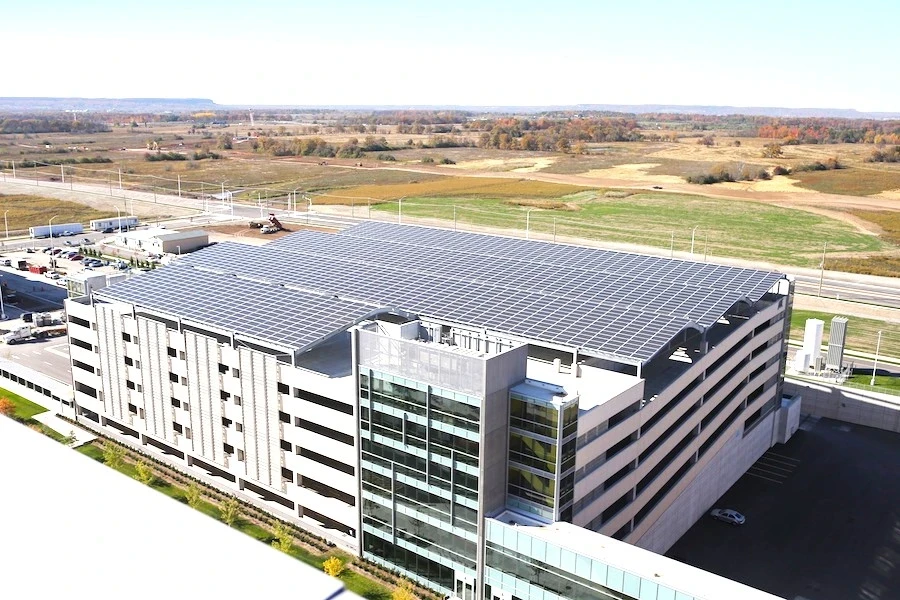 500 kWac rooftop solar system supports Ontario’s FIT 2.1 goals with 2,000 panels atop Oakville hospital garage.