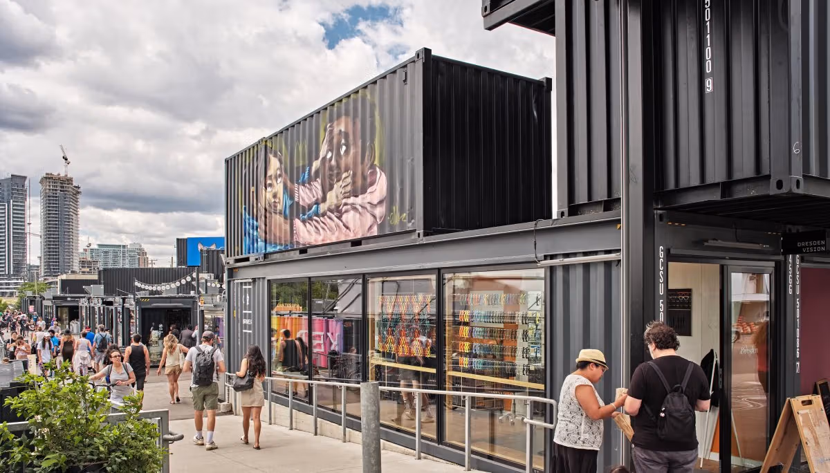 STACKT Market transforms shipping containers into a modular, vibrant retail hub on reclaimed Toronto land.